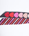Add a touch of charm with this Kate Spade striped silk scarf, featuring bold pink and red hues with heart accents. Perfect for accessorizing your bag, hair, or outfit with a playful yet elegant flair.