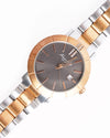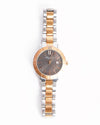 Kenneth Cole Quartz Watch offers a sophisticated look with its appealing dual-tone finish. It features a stainless steel bracelet and case, accented by copper gold- silver tone plating on the bezel and central links. The watch features a dark, sunray dial with applied hour markers, a date window, and possibly subtle crystal accents at the top .
