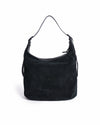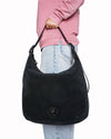 Kurt Geiger Large Chelsea Drench Soft Hobo is rendered in a single, saturated tone. This handbag is crafted from premium black suede with matching smooth leather trim. A standout feature is the signature eagle head emblem at the base, which is finished in a matching matte black to blend seamlessly into the suede. Finished with a wide leather shoulder strap and a secure top-zip closure.