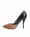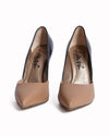 Lanvin Pumps feature a sleek pointed-toe D'Orsay silhouette, characterized by their elegant side cut-outs that beautifully frame the foot. The architectural design is elevated by a striking two-tone color palette, pairing a smooth beige leather toe with a high-shine black patent leather heel. The transition between the two materials is highlighted by fine tonal stitching that follows the graceful curve of the shoe.