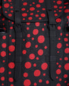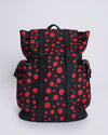 Louis Vuitton 2023 Yayoi Kusama Christopher Backpack. This highly sought-after piece from the collaboration collection features a striking design with a black base, boldly covered in Yayoi Kusama's signature red polka dot motif. The spacious backpack silhouette with a flap and buckle closures, along with practical side pockets, makes it both a functional accessory and a wearable work of art.