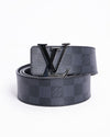 Louis Vuitton Black Belt is a stylish and timeless accessory. The belt is crafted from the brand's signature Damier Graphite canvas, a durable and instantly recognizable black and gray checkered pattern. It is accented with a sleek, polished gunmetal buckle featuring a bold, sculptural 'LV' logo.