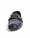Louis Vuitton Men's Driving Loafers In Black, these iconic loafers are meticulously crafted from premium smooth calfskin leather in a timeless obsidian black. The design is anchored by the house’s legendary silver-tone LV Initials plaque, which is elegantly integrated into a tonal leather strap across the vamp. Featuring a traditional moccasin construction with a hand-stitched toe.