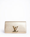 Louis Vuitton Neo Sobe Louise Gold Clutch is the perfect accessory to add a touch of glamour to any evening outfit. Crafted from a supple, lustrous metallic leather in a beautiful gold hue, this clutch is an eye-catching statement. The prominent flap features a large, gleaming Louis Vuitton "LV" logo flip-lock, which is both a secure closure and a bold design element. The bag’s structured, rectangular silhouette is both classic and modern
