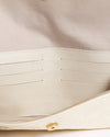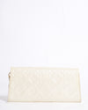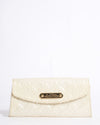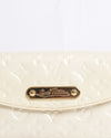 Golden Louis Vuitton Sunset Boulevard Patent Leather Clutch Bag. This chic and compact clutch-style bag is crafted from glossy Monogram Vernis patent leather in an elegant white hue, subtly embossed with the iconic LV monogram pattern. It features a sleek fold-over flap adorned with a gold-tone "Louis Vuitton" logo plaque, adding a sophisticated finish.