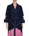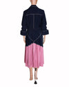 Lovebirds Pleated Dress in Navy and Pink is crafted in luxurious silk with a relaxed oversized bodice and deep V-neckline framed by a pointed collar. The sunray pleated skirt transitions from navy at the waist to vibrant pink at the hem, creating striking visual contrast. Finished with white contrast topstitching and a coordinated self-tie waist belt, this pre-loved piece is ideal for statement daywear and evening occasions.