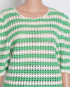 The Maje Knitted Top is a stylish and lightweight piece that effortlessly blends elegance with casual charm. Designed with a striped green and white pattern, this intricately knitted top features a breathable, openwork design that adds texture and sophistication. The cropped silhouette and short sleeves make it a perfect choice for warm-weather outings, pairing seamlessly with high-waisted jeans, skirts, or shorts. Whether dressed up with statement accessories or kept minimal for a relaxed look, this Maje top is a versatile addition to any modern wardrobe.