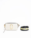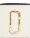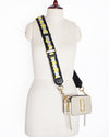 Marc Jacobs The Snapshot Camera Bag is a coveted accessory that blends signature style with modern design. The bag is crafted from a durable leather in a versatile beige. It features a structured, rectangular "camera bag" silhouette with dual zip compartments. The bag is instantly recognizable by the prominent, gold-tone 'J' logo hardware on the front. A bold, contrasting black and yellow striped webbing strap with "MARC JACOBS" branding adds a touch of high-fashion and allows for versatile crossbody wear.