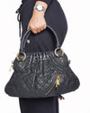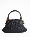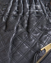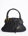 Marc Jacobs Quilted Leather Stam Satchel is a statement accessory that blends classic style with high-fashion design. The bag is crafted from a soft, black quilted leather with a beautiful, rich texture. It features a structured, satchel silhouette with dual rolled leather top handles and a secure top-zip closure. The most prominent detail is the chunky, polished gold-tone chain strap and the iconic kiss-lock closure on the top.