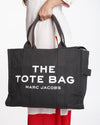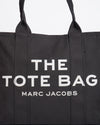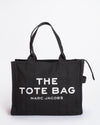 Marc Jacobs Canvas Black Tote Bag. This versatile tote features a structured, rectangular silhouette crafted from durable canvas in a classic black hue. "THE TOTE BAG MARC JACOBS" is prominently printed on the front in contrasting white, making a bold yet minimalist statement.
