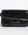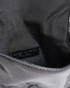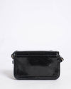 Marc Jacobs Groove Crossbody is crafted from premium black leather with a unique crinkled effect that adds textural depth to its high-gloss finish. The bag features a structured rectangular silhouette with a secure flap-over closure. It is elegantly finished with the polished gold-tone "Marc Jacobs" metal lettering on the front. Designed specifically to hold a smartphone and a few essential cards, it comes with a slim, adjustable leather crossbody strap.