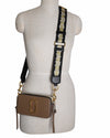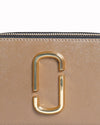 Marc Jacobs Snapshot Camera Bag is expertly crafted from durable beige Saffiano leather, featuring a refined cross-hatch texture. The bag is defined by its signature oversized Double-J hardware in a polished gold-tone finish on the front. Designed with two independent top-zip compartments, it provides organized storage for daily essentials within a compact frame. For a bold, sporty touch, it includes a wide, detachable webbing crossbody strap featuring the "MARC JACOBS" logo in contrasting white and gold glitter embroidery.