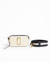 Marc Jacobs Snapshot Crossbody Bag is a stylish and instantly recognizable accessory. The bag features the iconic structured, dual-compartment, boxy silhouette, crafted from a smooth leather in a beautiful cream color. The design is a perfect blend of high-fashion and a modern, casual aesthetic, with a prominent double J-Marc logo on the front in a polished gold tone.