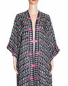 Masaba Classic Printed Cape is rendered in a premium black and white fabric, featuring a dense, horizontal-striped pattern interspersed with abstract motifs that create a sophisticated monochromatic visual. The design is defined by its fluid, open-front silhouette, allowing it to be draped effortlessly over both traditional and Western ensembles. A standout feature is the vibrant neon pink triangular accents that run vertically along the front borders, providing a high-contrast pop of color that is synonymous with the Masaba aesthetic.