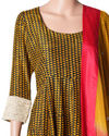 Preloved Masaba Set Anarkali is 3 Piece Set with Anarkali Top, Pants and Dupatta, the Anakali Top has Triangular Geometric Pattern all over the Top and Heavily Beaded Handcuffs with Adjustable Drawstrings in the Back and Flowy Fit Below Waist along with Red Pants and Dupatta
