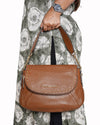 Michael Kors Aria Studded Medium Shoulder Bag,this versatile piece is meticulously crafted from premium pebbled calf leather in a rich, warm brown. The design is anchored by its curved fold-over flap, which features a sophisticated gold-tone micro-stud border adding a subtle, high-octane edge to the soft, pebbled texture. Featuring an adjustable leather crossbody strap and high-shine hardware.