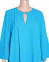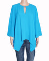 Michael Kors Asymmetric Top is a vibrant and modern wardrobe staple that combines a bold color palette with a dynamic, fluid silhouette. This garment is rendered in a striking blue fabric. The design is defined by its dramatic asymmetric handkerchief hemline, which creates a sharp, angular profile and adds a sense of movement to the piece. A standout feature is the plunging keyhole neckline, accented at the top with a polished silver-tone metal bar.