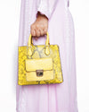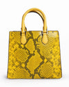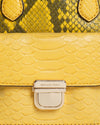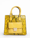 Michael Kors Bridgette Handbag with a crossbody strap, crafted from material with a yellow and black snakeskin pattern. This structured, square-silhouette bag features dual top handles and a long, adjustable crossbody strap. The front is accented with a large, curved flap pocket featuring a smooth yellow material and secured by a prominent gold-tone twist lock closure.