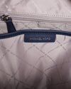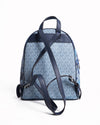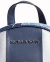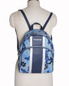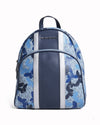 Michael Kors Backpack is expertly crafted from the house’s signature logo-print coated canvas, featuring a durable, easy-to-maintain finish. The design is defined by its striking butterfly motif in varying shades of blue, overlaid on the classic "MK" monogram background. A standout feature is the vertical racing stripe detail in navy leather and shimmering silver, which provides a sporty, structural contrast to the whimsical butterfly pattern.