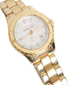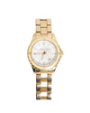 Michael Kors Gold-Tone Runway Watch for Women. Featuring a polished stainless steel bracelet in luxurious gold-tone, this timepiece exudes timeless elegance. The white dial is complemented by gold-tone hour markers and hands, with a date display window for added functionality. Designed with both fashion and practicality in mind, this watch is perfect for daily wear or special occasions.