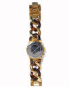 Michael Kors Chronograph Watch is meticulously crafted from high-luster gold-tone stainless steel, featuring a striking hybrid bracelet design. The timepiece is defined by its oversized, chunky chain-link strap, which masterfully alternates between polished gold-tone metal and rich, translucent tortoiseshell-brown resin.