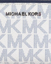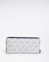 Michael Kors Jet Set Logo White Wallet. This versatile wallet features a durable coated canvas with an all-over monogram logo print in a sophisticated white and light blue palette. The convenient zip-around closure ensures your cards, cash, and coins are secure, and the interior offers ample space for organization.