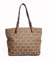 Michael Kors Tote is meticulously crafted from premium signature logo-print canvas in a versatile beige and brown palette, accented with high-quality leather trim. The design is defined by its spacious Jet Set silhouette, featuring an open-top construction and convenient side slip pockets for quick access to essentials.