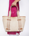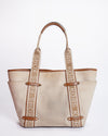 Michael Kors Maeve Tote in beige and brown. This versatile bag is crafted from a durable canvas with a stylish beige finish, complemented by a bold "KORS" logo print in brown down the sides. The tote features sleek brown leather trim and comfortable top handles.