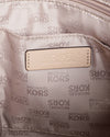 Michael Kors Pebbled Leather Tote is rendered in premium supple pebbled leather in a delicate petal pink. A standout feature is the polished gold-tone hardware, including the signature oversized "MK" logo charm that drapes elegantly from the handle. Finished with adjustable buckle-detailed straps and protective base studs.