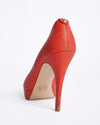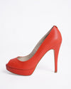 Michael Kors Peep Toe Pumps in a striking red. These eye-catching heels feature a classic peep-toe silhouette and a slender stiletto heel, creating a powerful and glamorous look. Crafted from sleek leather, they are perfect for adding a bold pop of color to any outfit, from tailored dresses to evening wear. The shoes are subtly branded with the Michael Kors logo.