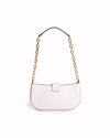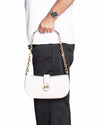 Michael Kors Small Carmen Pouchette, this essential accessory is meticulously crafted from premium Saffiano leather in a soft, ethereal powder pink. The design is anchored by its architectural "pouch" silhouette and high-octane gold-tone hardware, featuring the iconic circular MK logo charm that doubles as a sophisticated strap anchor. Featuring a versatile chain-link and leather strap.