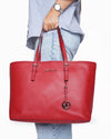 Michael Kors Tote Bag is the perfect blend of style and durability. Crafted from scratch-resistant Red Saffiano Leather, the bag features a structured, wide silhouette, ideal for carrying a laptop, files, and everyday essentials. It includes long, comfortable shoulder straps with buckle details and is subtly branded with the Michael Kors logo lettering and a removable MK circle charm.