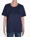 Michael Kors T-shirt in a deep navy blue is a stylish and casual piece with a touch of designer flair. The tee is crafted from a soft, comfortable material and features the "KORS" logo in a bold, raised lettering with a subtle sequin detail.