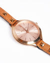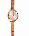 Michael Kors Wrap-Around Watch is a perfect blend of modern and edgy design. The watch features a large, round gold-tone case with a sleek, minimalist rose-gold dial. The standout detail is the long, brown leather strap, which is designed to wrap around the wrist. The strap is adorned with small, polished gold-tone spikes, adding a touch of bold, rock-and-roll-inspired flair.