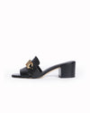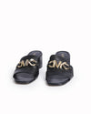 Michael Kors Izzy Logo Mules are rendered in a premium black smooth leather. he design is defined by its modern square-toe silhouette and a single wide vamp strap that provides a secure yet comfortable fit. A standout feature is the oversized, architectural gold-tone "MK" logo hardware positioned prominently across the strap, serving as a prestigious brand statement.