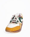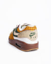 Nike Air Max 1 x Susan Missing Link Sneakers are a highly coveted and stylish collaboration piece. The shoes are a vibrant and unique colorblock design, with a mix of light beige, green, brown, and red. They are crafted from a combination of leather, corduroy, and suede, with a classic Air Max 1 silhouette. The sneakers feature a classic lace-up front with a signature Nike 'swoosh' logo on the side. The shoes have a visible Air unit in the heel and a comfortable, durable rubber sole.