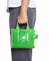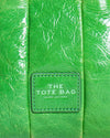 Marc Jacobs Mini Tote is crafted from premium crinkled patent leather in a striking electric green. The bag features the iconic structured rectangular profile with reinforced dual top handles and a secure top-zip closure. The front is prominently embossed with a tonal leather patch reading "THE TOTE BAG MARC JACOBS". Designed for ultimate versatility, it includes a matching slim leather crossbody strap that is both adjustable and detachable.