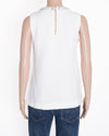 Miu Miu White Top with embellished neckline. This elegant sleeveless top is crafted from a crisp, white fabric and features a beautiful, intricate neckline adorned with sparkling crystals and beads. The clean, modern silhouette and subtle keyhole detail on the back add a touch of sophisticated charm. Perfect for a special occasion or for adding a hint of glamour to a casual ensemble, this top is a versatile and stylish piece for any collection.