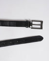 Montblanc Black Leather Belt for men, featuring a high-quality leather strap, possibly embossed with a pattern. The sleek, modern rectangular pin buckle is made of polished metal, with the Montblanc name subtly engraved on the side and the iconic emblem possibly centered on the loop.