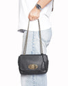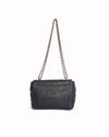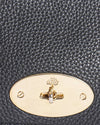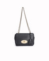 Mulberry Lily Chain Leather Shoulder Bag is rendered in premium black grained leather. The design is defined by its compact and structured flap silhouette, featuring rounded corners that give it a soft yet sophisticated profile. A standout feature is the iconic Postman's Lock, rendered in polished gold-tone hardware, which serves as both a secure fastening and a definitive Mulberry hallmark. Finished with the signature leather-interwoven gold-tone chain strap and a matching leather clochette containing a hidden padlock.