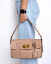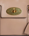 Mulberry Maple Bayswater Leather Shoulder Bag. This sophisticated bag features a structured silhouette in a versatile light beige leather, offering a refined yet relaxed aesthetic. The front flap is secured by the iconic postman's lock, a signature emblem of the Mulberry brand. With a comfortable shoulder strap and a classic design.