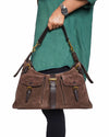Mulberry Roxanne Shoulder Bag is rendered in premium chocolate brown suede. The design is defined by its utilitarian silhouette, featuring multiple front pockets and decorative belt-and-buckle detailing that provide a signature "Mulberry" look. A standout feature is the antique brass hardware, which complements the deep brown hue of the suede and adds a vintage, lived-in feel to the piece. Finished with sturdy flat leather handles.