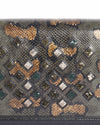 Bottega Veneta Embellished Snakeskin Leather Crossbody Bag is rendered in premium snakeskin leather, featuring a natural green scale pattern punctuated by vibrant golden-brown leopard-style spots for a dramatic, multi-tonal effect. A standout feature is the geometric embellishment on the front flap, where faceted square sequins arranged in a precise diamond grid to catch the light from every angle. Finished with a gunmetal-tone chain strap.