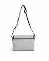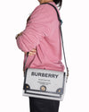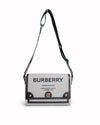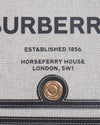 Burberry Horseferry Print Note Crossbody Bag is a sophisticated and modern accessory that pays homage to the brand's heritage with bold, industrial-inspired graphics. This bag is rendered in a durable grey cotton canvas. Finished with polished gold-tone hardware, including logo-engraved studs and a central magnetic snap, this bag includes a wide, adjustable black webbing strap.