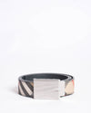 Burberry Belt featuring the iconic Vintage Check pattern on one side, rendered in the classic archive beige, black, and red colorway. The reverse side is crafted from smooth, high-quality black leathe.It is finished with a sleek rectangular brushed metal plaque buckle subtly engraved with the Burberry logo, making it a timeless and functional luxury accessory.