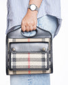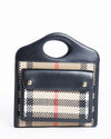 Burberry Mini Pocket Tote is a charming and iconic accessory. This limited-edition bag is a playful, miniaturized version of the brand's classic tote, crafted from a durable canvas with the iconic House Check plaid pattern. The bag is trimmed with a sleek black leather, which forms the structured top handle, convertible crossbody strap that can be worn in multiple ways. and the front pocket detail.