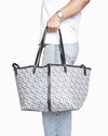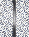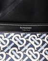 Burberry Monogram Tote Bag is rendered in a durable coated canvas featuring the TB (Thomas Burberry) Monogram print in a stylish navy and white colorway, offering a contemporary twist on the house's heritage. A standout feature is the slender black leather top handles, which are long enough to be worn comfortably over the shoulder, and the coordinating leather trim that reinforces the bag’s top edge. Finished with tonal stitching and a flexible construction.