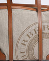 Burberry Patterson Canvas Logo Tote Bag, perfect for everyday use or travel. The bag is crafted from durable textured beige canvas and features a large, subtle circular Burberry logo graphic printed on the front. It is beautifully contrasted and trimmed with smooth Tan Leather on the dual top handles, piping, and corner accents, all finished with neat white stitching. The open-top tote includes a separate, matching canvas zip pouch for essentials