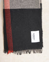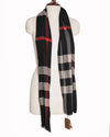 Burberry Woolen Checkered Scarf is rendered in a premium woolen blend, The design is defined by a bold, oversized check pattern, featuring a sophisticated color palette of deep black, charcoal grey, and ivory white, accented by a striking crimson red stripe. A standout feature is the delicate eyelash fringe along the edges.
