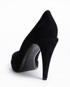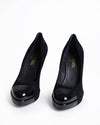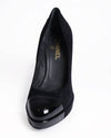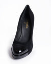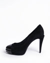 Chanel Cap Toe Platform Pumps are a quintessential luxury staple. The shoes are crafted from a supple black suede or fabric, which beautifully contrasts with the glossy black patent leather of the cap toe. This signature cap toe, a hallmark of Chanel's footwear, adds a classic and polished detail. The platforms provide a comfortable lift, while the elegant heel elongates the leg for a sleek and refined silhouette.
